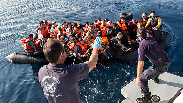 Members of the Hellenic Coast Guard rescue migrants and asylum seekers from an overcrowded rubber dinghy found drifting in the sea off Lesbos island in Greece. October 4, 2015