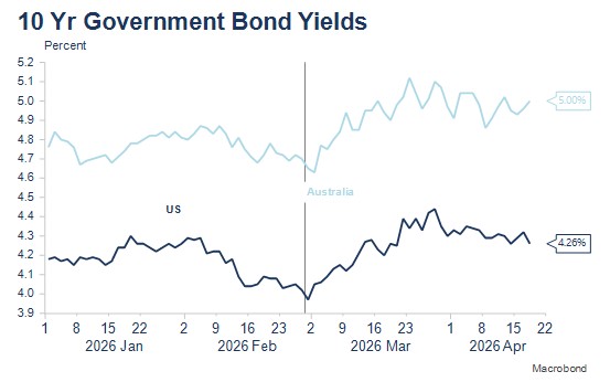 Short-term interest rates and longer-term bond yields were relatively quiet over the week, before dropping sharply on Friday on news of the reopening of the Strait of Hormuz. Some rebound is likely early on Monday given weekend developments. US markets continue to price some mild risk of a further US rate cut, though a full rate reduction is not priced until July 2027. Meanwhile, Australian shorter-term yields further discounted a third successive interest rate rise by the RBA, this now being 77% priced for May and 99% priced by June. I continue to think a June move is more likely.