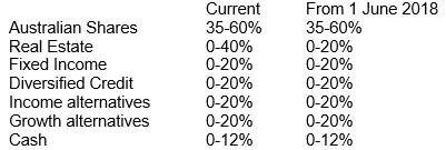 Following a strategic asset allocation review, the following changes will take effect from 1 June 2018: Fixed Income benchmark will change from: 50% Bloomberg AusBond Composite 0+Yr Index and 50% Bloomberg Barclays Global Aggregate Index (hedged to AUD) to Bloomberg AusBond Composite 0+ Yr Index Real Estate benchmark will change from: Asset weighted composite of the S&P/ASX 300 A-REIT Total Return Index (listed Property securities) and Mercer/IPD Australian Pooled Property Fund Index (unlisted property securities) to S&P/ASX 200 A-REIT - Total Return Index Investment Guidelines will change from: